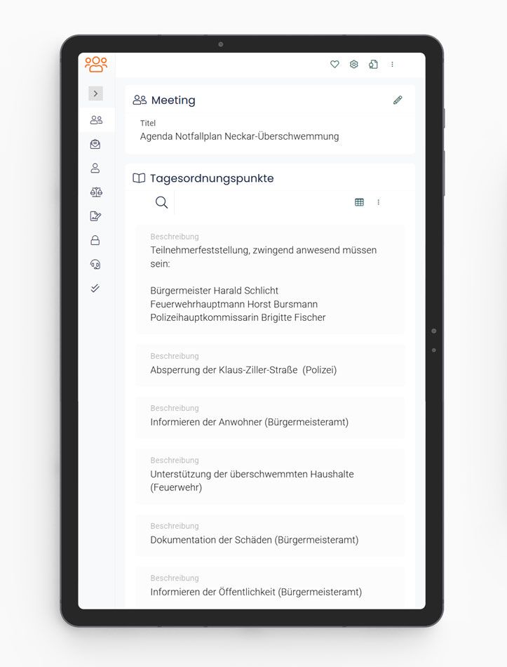 Zusätzlich sollten die wesentlichen Ansprechpartner bereits in einem Teilnehmerverzeichnis gespeichert sein. Tritt der Krisenfall ein, können die Einladungen für die entsprechenden Gremien per Knopfdruck versendet werden. Der Krisenstab kann dann innerhalb weniger Stunden tagen und verfügt bereits über einen Notfallplan, eine Agenda und alle notwendigen Personen sind informiert.