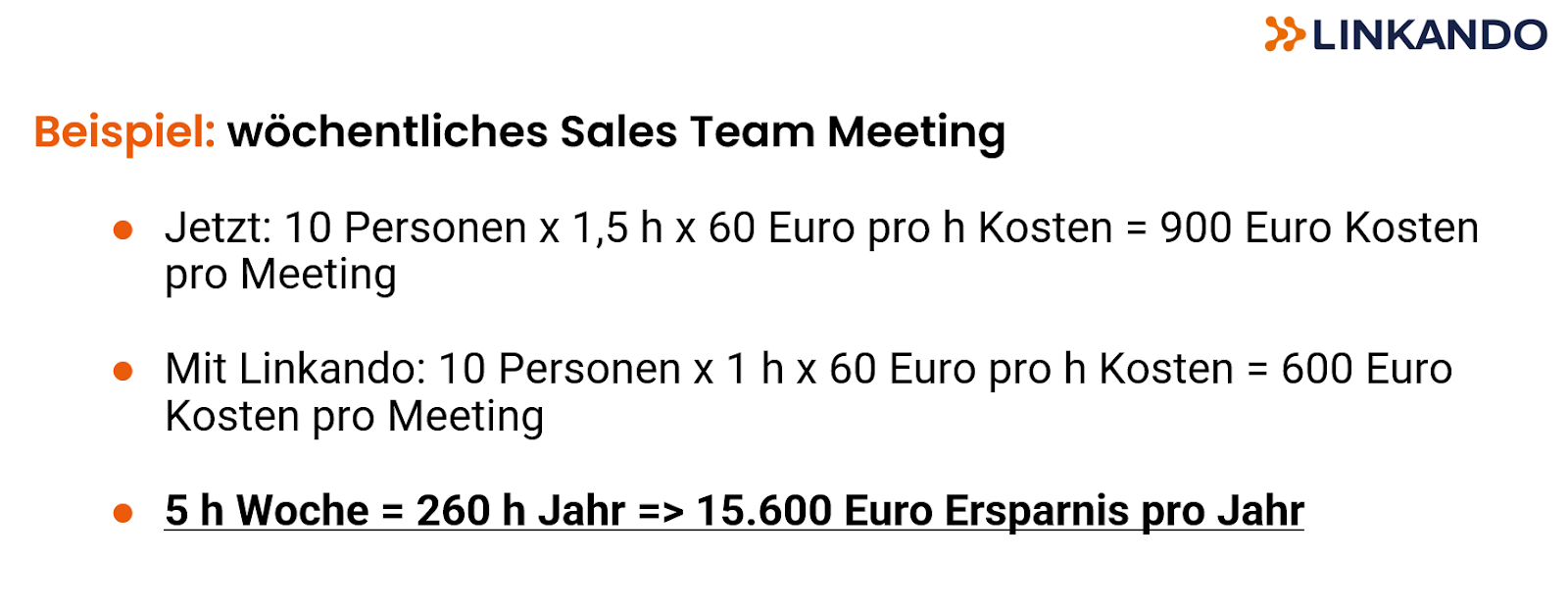 Die folgende Beispielrechnung des FOM-Anbieters Linkando verdeutlicht, wie wichtig eine effiziente Meetingkultur ist:
