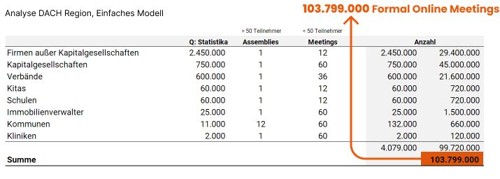 In Deutschland werden laut Schätzungen des FOM-Softwareanbieters Linkando pro Jahr bis zu 100 Millionen formelle Meetings abgehalten. Den Löwenanteil machen privatwirtschaftliche Unternehmen aus, dazu kommen formelle Meetings von Verbänden, Vereinen, Schulen, Kommunen und mehr.