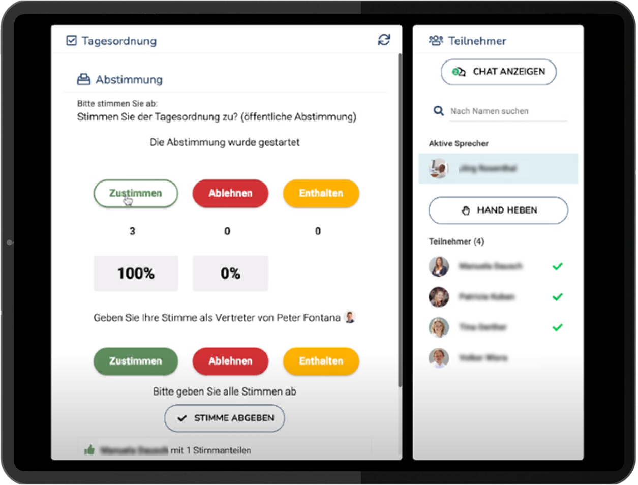 Für jedes Meeting kann ein Teilnehmerverzeichnis mit Stimmrechten angelegt werden. Während des Meetings können einzelne Sachverhalte zur demokratischen Entscheidungsfindung freigegeben werden. Je nach Unternehmen können die zur Abstimmung stehenden Fragen zum Beispiel harmlose Belange wie Teamevents sein oder geschäftsrelevante Fragen wie die Einstellung neuer Teammitglieder odersogar die strategische Ausrichtung des Unternehmens.